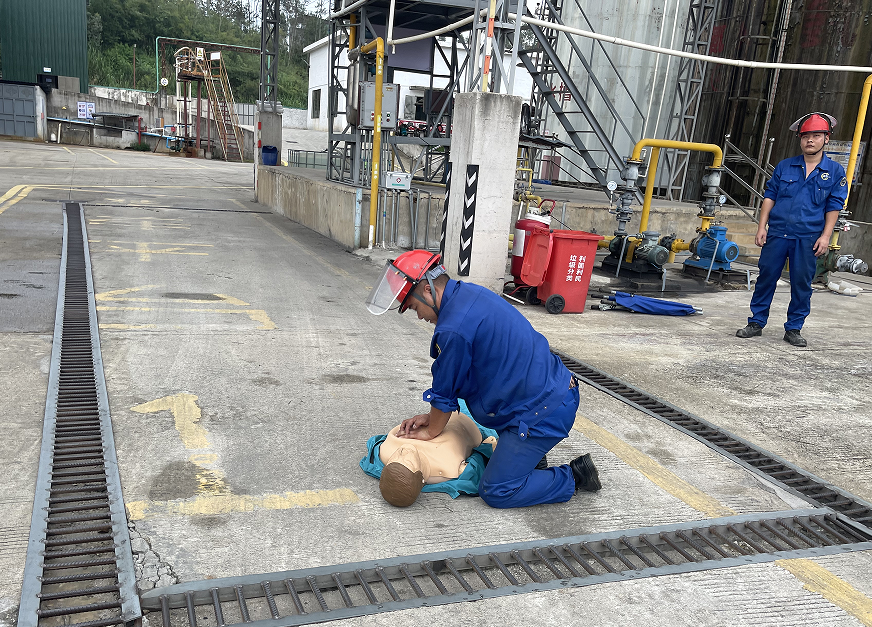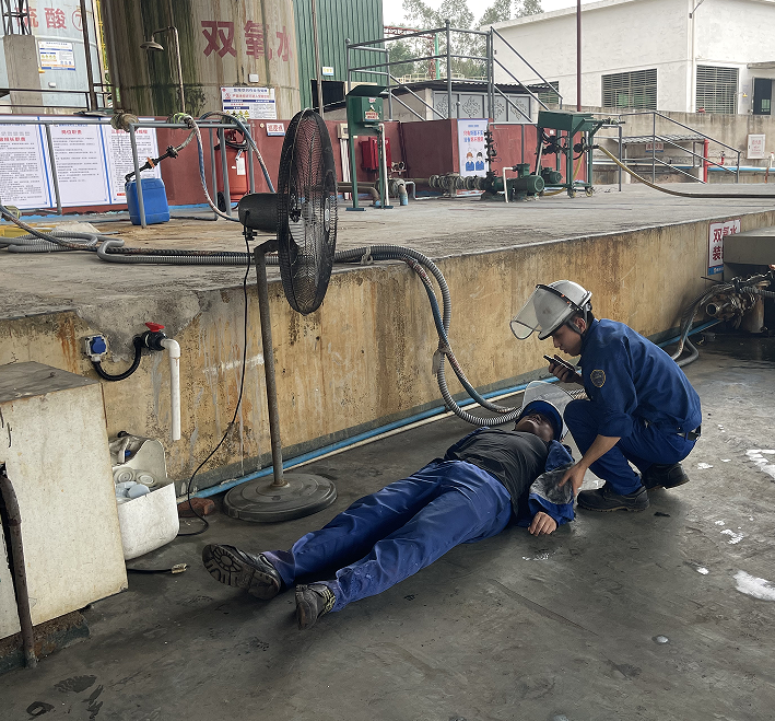 模擬三酸車間充裝人員在作業(yè)過(guò)程中挪動(dòng)風(fēng)扇時(shí),濕手不小心觸碰到破損的電纜線導(dǎo)致觸電。附近正在作業(yè)的同事發(fā)現(xiàn)有人觸電后立即大喊:“有人觸電了,有人觸電了”,同時(shí)迅速斷開(kāi)該電纜線電源開(kāi)關(guān)。周邊同事聽(tīng)到后,迅速過(guò)來(lái)幫助受傷人員躺平,并按照相關(guān)程序及時(shí)上報(bào)。查看傷勢(shì)情況,隨后立即組織人員報(bào)120并對(duì)受傷者進(jìn)行心肺復(fù)蘇,待120急救車到來(lái)后,協(xié)助120急救人員抬上急救車并安排人員一同前往,妥善處置。
