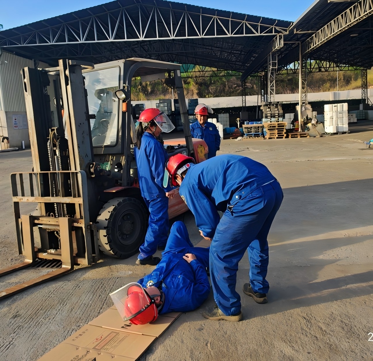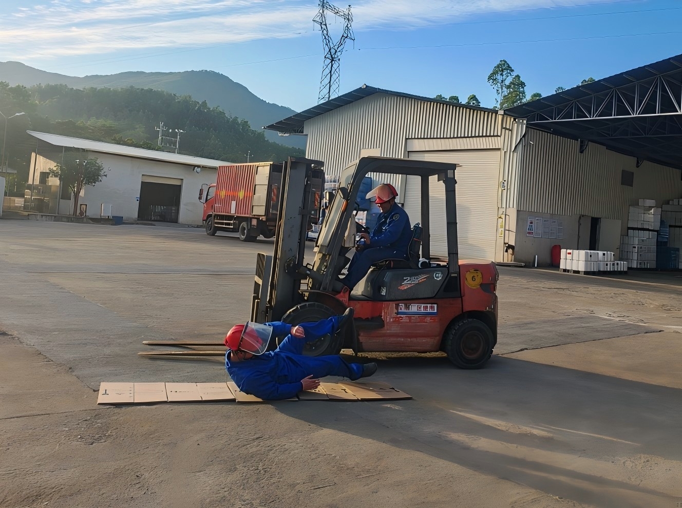 模擬三酸車間叉車駕駛員操作叉車運作貨物時,因滿載貨物視線不良,未注意好前方情況,與正在盤點貨物的倉管員發(fā)生碰撞。