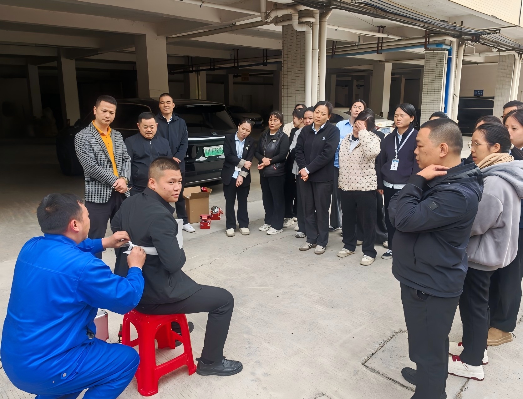 向大家講解當出現(xiàn)傷口時如何進行有效處理及三角巾的包扎方式等,大家都認真觀摩學習。